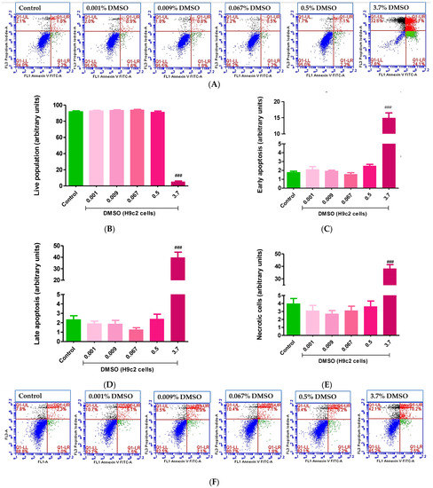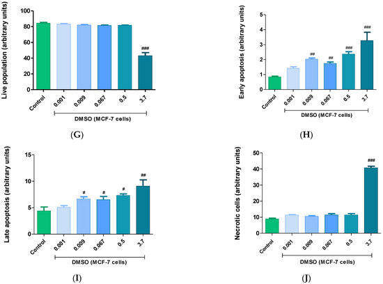 Dimethyl sulfoxide (DMSO)-induced apoptosis in the H9c2 cardiomyoblasts and MCF-7 breast cancer cells. (A) Flow cytometry scatter plot, (B) live population, (C) early apoptotic, (D) late apoptotic and (E) necrotic H9c2 cells. (F) Flow cytometry scatter plot, (G) live population, (H) early apoptotic, (I) late apoptotic and (J) necrotic MCF-7 cells. Cells were treated every second day for 6 days with varying DMSO concentrations (0.001, 0.009, 0.067, 0.5, and 3.7%). Data are presented as the mean ± SEM of 3 biological experiments with 3 technical repeats (n = 3). Data are presented as the mean ± SEM of 3 biological experiments with 3 technical repeats (n = 3). Significance is indicated as # p < 0.01, ## p < 0.01, and ### p < 0.001 versus the control.