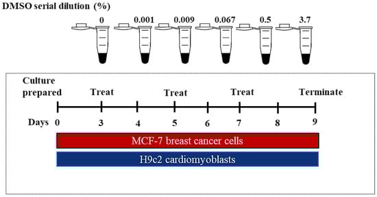 MCF-7 human breast cancer cells and H9c2 cardiomyoblasts were purchased from the American Type Culture Collection (ATCC, catalogue number HTB-22 and CRL-1446, respectively). Both cell lines were cultured in DMEM supplemented with 10% Fetal Bovine Serum (FBS, Thermo Fisher Scientific, Waltham, MA, USA) under standard tissue culture (TC) conditions (37 °C, 95% humidified air, and 5% CO2). The cytotoxic threshold of DMSO was investigated on the MCF-7 and H9c2 cells, using a series of concentrations (0.001, 0.009, 0.067, 0.5, and 3.7%). These concentrations were randomly selected from a previously conducted preliminary study on healthy cardiomyoblasts (Figure S1, Supplementary Materials). Briefly, treatment was prepared in DMEM without phenol (Lonza, Walkersville, MD, USA), supplemented with 2% FBS. Prior to the experiments, the DMSO treatment was filter-sterilized using 0.22 μM syringe filter systems in a Class II Type A2 Biological Safety Cabinet. To assess the chronic effect of DMSO on the H9c2 and MCF-7 cells, the cells were treated every second day for 6 days, as demonstrated in Figure 6. Biochemical assays were conducted after terminating treatment.