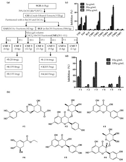 Bio-assay guided fractionation and isolation from SGR. Schematic isolation procedures of fractions and compounds from SGR were described in (a). Structures of the chemicals (#1–6) were shown in (b). Inhibition rates of 10 fractions (c) and 6 compounds (d) on XOD were evaluated and plotted by Graphpad. Values were presented as mean ± SEM of five replicates. SGR: Smilacis Glabrae Rhizoma; CEE: Crude Ethanol Extracts; EAF: EtOAc Fractions; BUF: n-BuOH Fractions; CMF: CHCl3-MeOH Fractions.