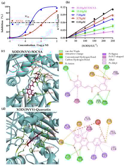 Interaction between 5OCSA and XOD in vitro and in silico. (a) IC50 of 5OCSA and AP on XOD. Plots of v (∆OD295/min)/XOD concentration with different concentrations of 5OCSA (b). Predicted binding mode of 5OCSA docked into XOD. 3D and 2D docking patterns of 5OCSA (c) and quercetin (d) into 3NVY has been generated by Discovery Studio 4.5. 5OCSA: 5-O-caffeoylshikimic acid; XOD: xanthine oxidase; AP: allopurinol.