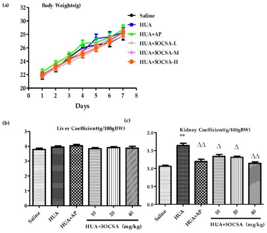 To investigate whether 5OCSA could ameliorate HUA in vivo, we generated a PO/HX-induced HUA mice model as described in 4.4. As shown in Figure 3a, during the 7 days of HUA modeling, the body weights (BWs) increased steadily and there is no statistically differences among groups. Additionally, organ coefficients (liver and kidney) have also been investigated. There are no significant differences in liver coefficients among groups (Figure 3b), while kidney coefficients of HUA mice increased significantly, compared with the normal saline group (Figure 3c, 1.64 g/100g BW vs. 1.06 g/100g BW, p < 0.01). Compared with HUA group, different doses of 5OCSA could all significantly reduce the kidney coefficient (all p < 0.05), indicating 5OCSA probably has nephroprotective effects in HUA mice. Therefore, no obvious harmful effects in BWs and organ coefficient (liver and kidney) have been observed in HUA mice when treated with 40 mg/kg BWs or below of 5OCSA.