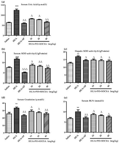 To verify the XOD inhibition effects of 5OCSA in vivo, we evaluated the XOD activity in liver and serum. As shown in Figure 4b,c, after seven consecutive days treatment of activities of PO/HX, serum XOD and hepatic XOD increased by 53.97% and 32.31% respectively compared with saline group (11.64 vs. 7.56 U/g Protein); 16.87 vs. 12.75 U/g Protein, all ** p < 0.01). Compared with HUA group, 5OCSA at 10, 20 and 40 mg/kg notably and dose-dependently decreased XOD activities by 25.17%, 29.64% and 38.66%, respectively, in HUA mice liver (8.71, 8.19 and 7.14 vs. 11.64 U/g Protein). Similarly, compared with HUA group, 5OCSA at 10, 20 and 40 mg/kg also dose-dependently decreased XOD activities by 12.80%, 15.18% and 16.89%, respectively, in HUA mice liver (14.71, 14.31 and 14.02 vs. 16.87 U/g Protein). Results mentioned above suggested that 5OCSA could also inhibit XOD in vivo.