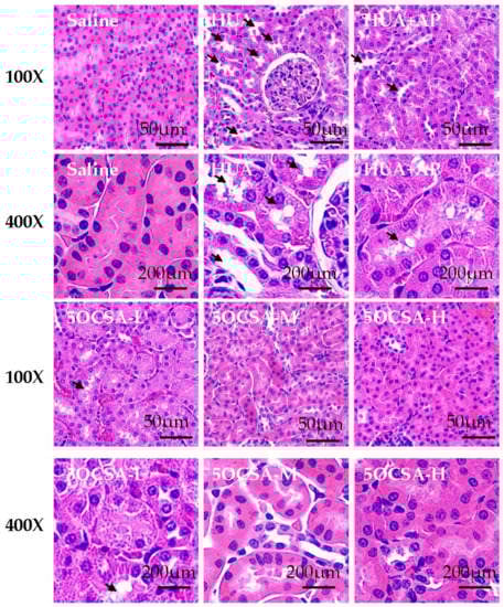 Creatinine (Cr) and Blood urea nitrogen (BUN), two kidney injury indicators, were also examined. As shown in Figure 4d,e, the serum Cr and BUN in HUA group increased by 30.31% and 48.52% as compared to saline group respectively (33.32 vs. 25.57 μmol/L; 10.04 vs. 6.76 mmol/L), suggesting occurrence of kidney injury in HUA mice. Compared to the HUA group, different doses of 5OCSA could significantly reduce Cr level by 13.24% (10mg/kg BWs, 28.91 μmol/L), 18.00% (20 mg/kg BWs, 27.33 μmol/L) and 22.69% (40mg/kg BWs, 25.76 μmol/L) as well as the BUN level by 13.45% (10 mg/kg BWs, 8.69 mmol/L), 18.23% (20 mg/kg BWs, 8.21 mmol/L) and 25.40% (40 mg/kg BWs, 7.49 mmol/L), indicating 5OCSA probably has a protective effect on kidney injury in HUA mice. To examine the structural deterioration in the kidneys of HUA mice, we performed H&E staining. In the saline group, the renal tubulars of mice were intact and smooth. Compared to the saline group, the HUA model group exhibited tubular dilation and vacuole in renal tubular epithelial cells. Compared to HUA group, the levels of renal tubular dilation were significantly reduced after the administration of different doses of 5OCSA (Figure 5).