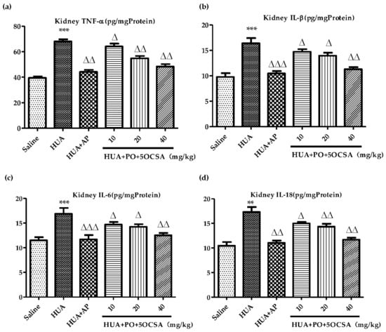 Effects of 5OCSA on kidney inflammation cytokines in HUA mice. (a) TNF-α (pg/mg Protein); (b) IL-1β (pg/mg Protein); (c) IL-6 (pg/mg Protein); (d) IL-18 (pg/mg Protein). Data are represented as mean ± SD (n = 8). ** p < 0.01, *** p < 0.005, compared with saline group; ∆ p < 0.05; ∆∆ p < 0.01, ∆∆∆ p < 0.005, compared with HUA group. TNF-α: tumor necrosis factor-α; IL-1β: interleukin-1β; IL-6: interleukin-6; IL-18: interleukin-18.
