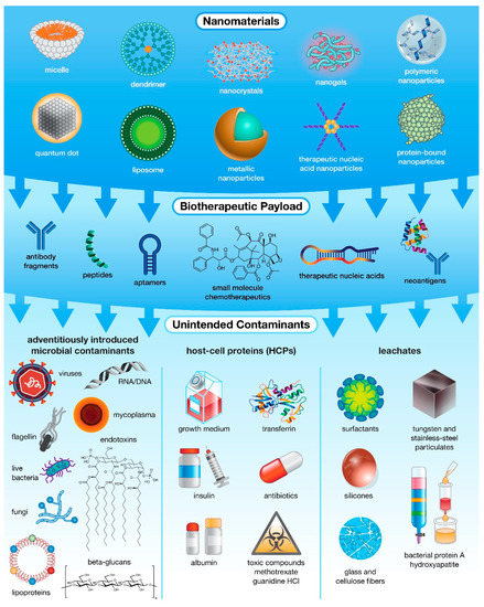 The many levels of possible unintended contamination in drug products. While most often associated with microbial contamination, unintended impurities can actually be introduced into pharmaceutical products from multiple sources, including raw materials and specialized host-cell reagents, and at various stages of production, ranging from fabrication and payload encapsulation in nanocarriers to purification of the final formulation.