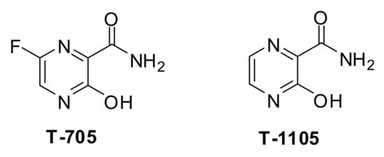 - Furuta, Y.; Takahashi, K.; Shiraki, K.; Sakamoto, K.; Smee, D.F.; Barnard, D.L.; Gowen, B.B.; Julander, J.G.; Morrey, J.D. T-705 (favipiravir) and related compounds: Novel broad-spectrum inhibitors of RNA viral infections. Antivir. Res. 2009, 82, 95–102. [Google Scholar] [CrossRef]