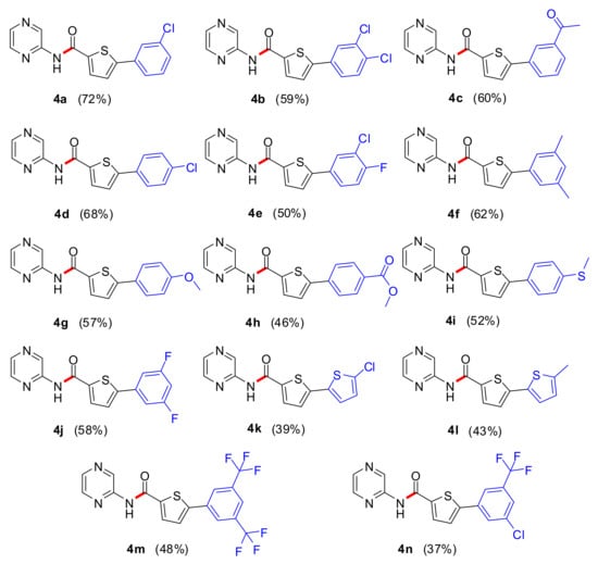 The reaction of pyrazine-2-amine (1) with 5-bromothiophene-2-carboxylic acid (2) in the presence of pyridine and titanium tetrachloride was used to produce 5-bromo-N-(pyrazin-2-yl)thiophene-2-carboxamide (3) with 75% yield, as shown in Scheme 1. Thereafter, compound 3 was treated with different aryl boronic acids/pinacol esters by using catalyst Pd(PPh3)4, potassium phosphate and solvent 1,4-dioxane. The derivatives of 5-bromo-N-(pyrazin-2-yl)thiophene-2-carboxamide (4a–4n) were obtained with moderate and good yields (37–72%). The structural representation of these molecules and their yields are provided in Figure 2. Compound 4a showed the maximum yield (72%), while compound 4n exhibited the lowest yield (37%). The compounds having substitution 3,4-dichloro (4b), 3-methylcarbonyl (4c), 4-chloro (4d), 3-cholro4-fluoro (4e), 3,5-dimethyl (4f), 4-methoxy (4g), 4-methylthio (4i) and 3,5-difluoro (4j) were also synthesized with good yields. It was noted that the synthesized molecules obtained from thiophene boronic acid pinacol esters and bulky group substituted phenylboronic acid exhibited a low yield as compared to other molecules. It is noteworthy that the boronic acids and the pinacolate esters having electron-donating moieties provided good yields while the electron-withdrawing moieties provided lower yields [32]. Exceptionally, compound 4a provided a good yield.