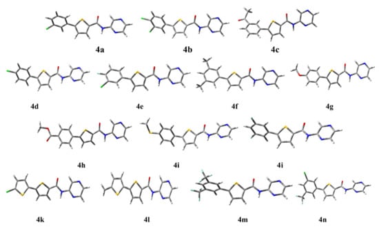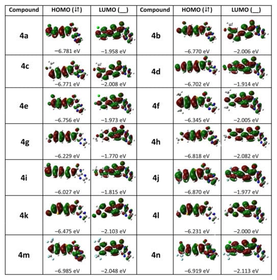 The molecular orbitals of all the compounds 4a–4n have almost the same pattern but some compounds have a different one. In most of the compounds, the density of molecular orbitals is mostly spread over the thiophene and benzene rings, but there are some compounds in which the density of molecular orbitals also spreads over the pyrazine ring. A plot of these surfaces is displayed in Figure 4.