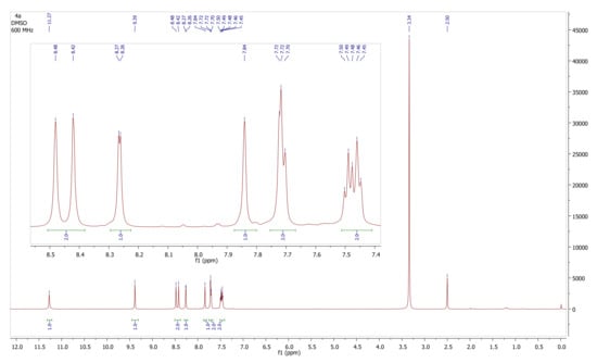 NMR is the most important technique for determining the accurate structure of organic compounds. Quantum calculations are found to be sufficiently accurate in calculating NMR spectra and studying the relationship between the molecular structure and its chemical shifts. Therefore, the use of theoretical methods is very useful for augmenting the confidence in explaining the structure of molecules [39,40,41]. In this study, the experimental 1H spectra (4a–4n) were recorded in 1,4-dioxane while the calculation of the 1H and 13C NMR spectra was performed using the same level of theory as for the optimizations. The comparison of the experimental and theoretical calculated 1H NMR data of compound 4a is provided in Table 1 while the 1H NMR data of the remaining compounds 4b–4n are provided in the Supplementary Materials (Tables S1–S13). It can be seen that the performance of the NMR calculations was very good and the mean absolute error (MAE) is only 0.25 ppm.