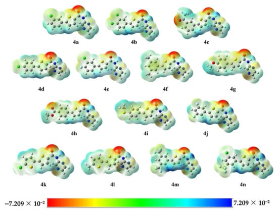 In the maps of the MESP of compounds 4a–4n (Figure 5), the red color shows that the most negative ESP regions are mainly located over the oxygen of the carbonyl group, which is a suitable position for the attack of electrophiles while the blue color shows that the most positive ESP regions are mainly located over the hydrogen of the amide group, which is a suitable position for the attack of nucleophiles. The maps of the MESP of compounds 4a–4n are provided in Figure 6.