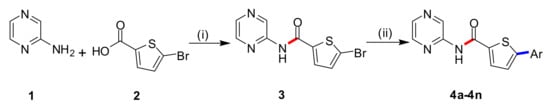 Synthesis and arylation of 5-bromo-N-(pyrazin-2-yl)thiophene-2-carboxamide (3) to form analogs (4a–4n).