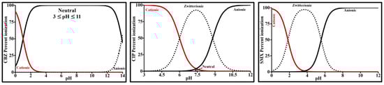 CIP, a fluoroquinolone antibacterial agent, contains a secondary alkylamine, two tertiary arylamines (aniline-like amines), and a carboxylic acid. It has one fluorine, which is conjugated to the carboxylic acid functional group. With these multiple functional groups, CIP possess both acidic and basic characteristics. It is an amphoteric zwitterionic compound with acid dissociation constants of 6.0 ± 0.1 (pka1) and 8.8 ± 0.1 (pka2). As shown in Figure 1, it is primarily cationic below pKa1, anionic above pKa2, and zwitterionic/neutral between pka1 and pka2. pKa1 corresponds to the dissociation of the carboxylic acid and pKa2 to the protonation of the piperazinyl ring N atom (NH2+) [38,39]. Its isoelectric point (IEP = (pKa1 + pKa2)/2) is about 7.4.