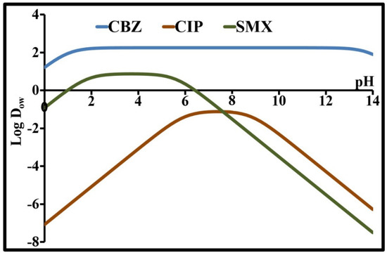 For CBZ, a neutral species, P and Dow are identical and are equal to 2.25 in the pH range from 3 to 11. This value shows that this compound is preferably associated with a lipid phase. The negative Log D8 values for CIP and SMX suggest that these compounds would be more likely to have a high solubility in water and a low lipophilicity. These two compounds are more likely to be found in the water than in the organic matter of surface waters. Inversely, CBZ shows the opposite behavior.
