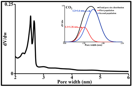 Pore size distribution obtained by N2 desorption at 77 K and CO2 adsorption at 273 K.