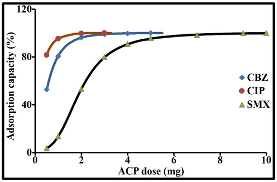 The textural properties of an adsorbent affect the adsorption equilibria. Knowledge of these properties is essential to more accurately interpret the adsorption mechanisms of all molecules, whether organic or otherwise. Textural analysis of the activated carbon powder (ACP) was therefore performed by N2 adsorption/desorption, CO2 adsorption and particle size measurement. Its main texture parameters are provided in Table 2. This activated carbon has a particle size of less than 120 µm and an average diameter of around 24 ± 1 µm. 7.5% by mass of its particle size distribution is below 2 µm and 56% is below 20 µm. It is also characterized by a large specific surface area, as well as a polydisperse pore size distribution, with 95% below 3 nm and 64% below 2 nm (maximum micropore size). Virtually all of its mesopores are between 2 and 6 nm. The macropore population (>50 nm) is negligible (Figure 4). These meso- and macropores can contribute to the transport of micropollutants by diffusion of the liquid phase into each particle. Macropores constitute pathways to the internal surface of the activated carbon. These pores govern diffusion rates, which in turn limit the solute adsorption rate. The microporous space represents 53% of the total porosity of ACP. It increases the sorption capacity. Furthermore, the overlapping force fields generated by the micropore walls lead to an increase in the adsorption potential within these cavities. The microporosity in this activated carbon is predominant. The minimum micropore size for this activated carbon (0.95 nm) is accessible to CBZ and SMX (width and height < 0.6 nm). CIP can reach pores larger than 1 nm. The specific surface areas of its micropores, mesopores and macropores represent respectively 73%, 21% and 6% of the total specific surface area according to the t-plot model. N2 and CO2 give virtually the same micropore surface areas and volumes.
