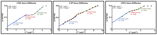 Weber-Morris plots for the sorption of CBZ, CIP and SMX by ACP Norit SA Super in drinking water (2 µg/L; ACP: 10 mg/L; pH = 8.1, T = 293 K).