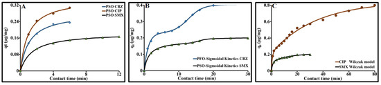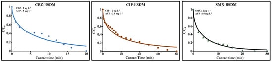 Figure 6 illustrates the influence of contact time on the individual sorption processes of the three molecules on Norit ACP. In accordance with the dosage choices, the kinetic curves were marked by a continual drop in residual concentrations until complete elimination of each molecule in the solution is achieved. The relative profiles of these kinetics indicated (i) rapid sorption of CBZ and SMX compared to CIP, and (ii) a rapid, sharp drop in the SMX concentration compared to CBZ during the first 13 min. After 13 min, elimination reached 85% for SMX, 80.5% for CBZ and 52% for CIP. Sorption at the surface and in the different porous compartments of the ACP will, of course, depend on the concentration gradient in the solution—and also on the intrinsic characteristics of the ACP and of each molecule. CIP, which is zwitterionic and has a greater molecular mass and larger geometric dimensions than CBZ and SMX, showed relatively slower kinetics. The inflection points observed on each curve corresponded to the beginning and end of the different sorption processes undergone by the contaminant. The first inflection point marked out a zone that characterized the initial sorption rate. This initial rapid phase lasted 6.4 min for both CBZ and CIP and 14.2 min for SMX. Following this phase, around 59% of CBZ, 39% of CIP and 86.5% of SMX was eliminated. This phase resulted from an initially high concentration gradient and varied from one product to another according to the molecular mass and the size and chemistry of each molecule (polarity, charge, etc.).
