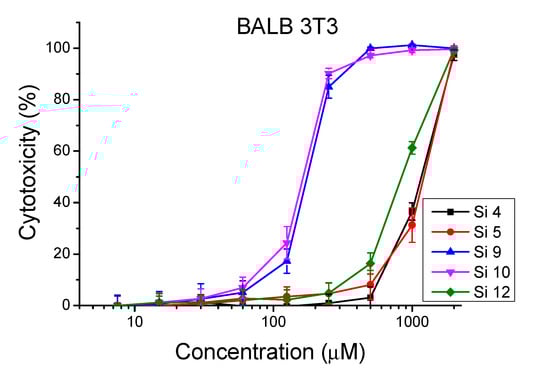 Cytotoxic effects of newly synthesized compounds. Dose–response curves for cytotoxicity assessment in BALB 3T3 cells. Values are means ± standard deviation from three independent experiments, n = 6.