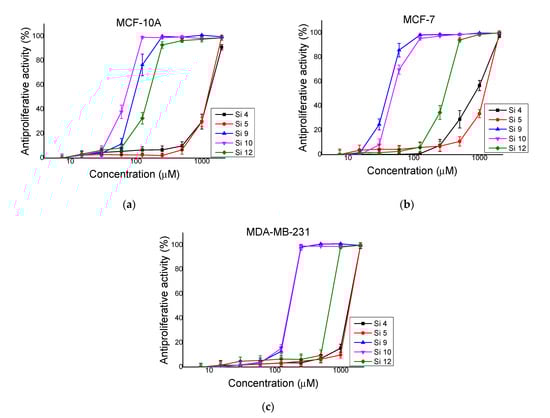 In MCF-10A cells (Figure 2a), the least antiproliferative effect was caused by Si4 and Si5 (IC50 = 1326 ± 69.5 and IC50 = 1289 ± 38.1, respectively). In the cell line MCF-7, the strongest antitumor effect was shown by Si9 and Si10, with IC50 = 45 ± 4.2 and 50 ± 1.7, respectively (Figure 2b). The test substances were weakly active in the MDA-MB-231 cells (Figure 2c).