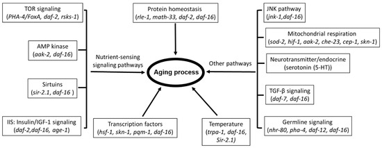Over 70 genes have been implicated in the pathways regulating the lifespan of C. elegans [38], with a high likelihood of further expansion on the current number. These genes are involved in the nutrient-sensing signaling pathways, including Target of Rapamycin (mTOR) signaling, AMP-activated protein kinase (AMPK)-dependent signaling, sirtuins, and insulin/IGF-1 signaling (IIS). Other implicated pathways include the JNK pathway, TGF-βsignaling, germline signaling, and mitochondrial respiration as well as other factors leading to aging process such as protein homeostasis, temperature, transcription factors, and so on. The representative genes that are involved in those pathways are listed in Figure 1.