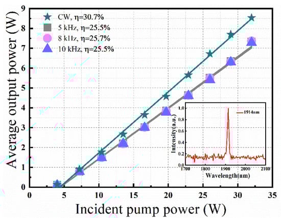 Subsequently, when the AO Q-switch was turned on, stable high-repetition-rate pulse operation was realized with the repetition frequency varying from 5 kHz to 10 kHz. As shown in Figure 2, similar output powers and slope efficiencies were obtained under different repetition frequencies. Because when the pulse period is much shorter than the upper-level lifetime of the laser crystal, the spontaneous radiation loss can be ignored. Under the incident pump power of 32 W, the maximum average output powers were 7.32 W, 7.36 W and 7.28 W under the repetition rates of 5 kHz, 8 kHz and 10 kHz, corresponding to the slope efficiencies of 25.5%, 25.7%, and 25.5%. In the inset of Figure 2, the output spectrum was recorded by a spectrometer (AvaSpec-NIR-S-350-2080) at a center wavelength around 1914 nm with an FWHM of 7 nm. The ONSR (optical signal to noise ratio) for the obtained laser emission was 34.4:1 based on Gaussian fitting. Considering that the resolution of the spectrometer is only 4 nm, the measured spectral width is not accurate.