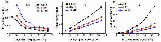 Simulation results for the AO Q-switched Tm:YLF laser: (a) pulse durations, (b) pulse energies and (c) peak powers versus incident pump powers.