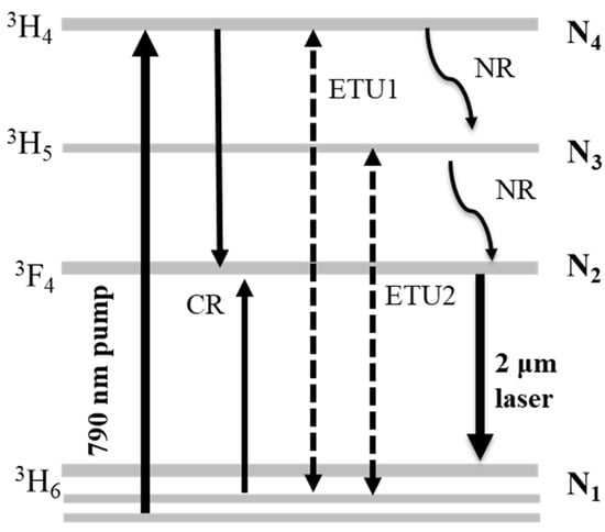 To better understand the pulse output characteristics, the quasi-three-level scheme of the Tm3+ ion with energy transfer processes is described in Figure 5. Based on 790 nm pump sources, the population of the 3H6 ground state (N1) is excited to the 3H4 energy level (N4). Due to the short lifetimes of the excited states 3H4 and 3H5 (N3), the population jumps down to the 3F4 energy level (N2) through two non-radiative relaxation (NR) transitions. Finally, the laser emits around 2 μm during the transition from 3F4 to 3H6. However, unlike the ordinary quasi-three-level structure, there is a strong cross-relaxation (CR) mechanism between the two Tm3+ ions for the 3H4 + 3H6 → 3F4 + 3F4 level transition processes, which results in a high Stokes efficiency of 0.82, in theory [10].