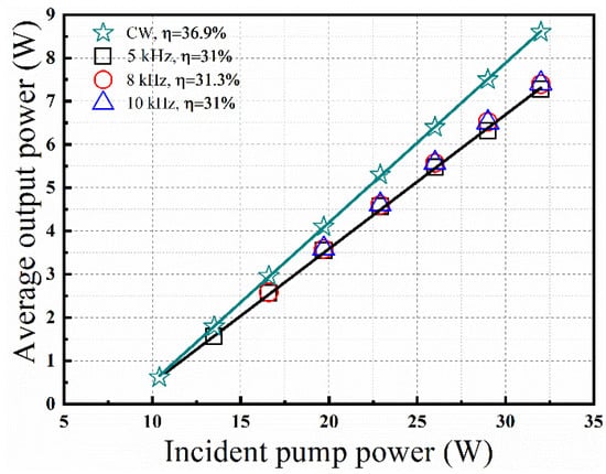 Firstly, the CW running performance of the Tm:YLF laser is numerically simulated by setting the loss ζ(t) to 0 over the entire time interval. The rate Equations (1)–(10) are solved numerically by a computer based on the four-order Runge–Kutta algorithm. As shown in Figure 6, the numerically calculated output powers increase almost linearly with incident pump powers. Under the pump power of 32 W, the maximum average output power is 8.6 W for the numerical simulation, corresponding to the slope efficiency of 36.9%. On the whole, the theoretical and experimental results are generally consistent, although the theoretical simulation has higher threshold power.