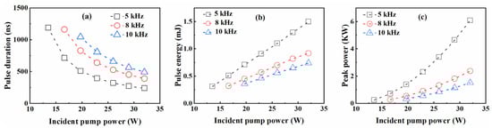 Experiment results for the AO Q-switched Tm:YLF laser: (a) pulse durations, (b) pulse energies and (c) peak powers versus the incident pump powers.