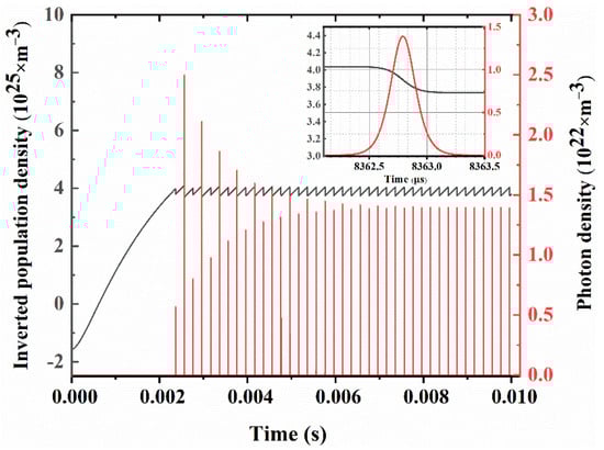 Figure 8 clearly shows the temporal evolutions of the population inversion density (gray line) and the intracavity photon density (red line) in 0.01 s under the maximum output power of 32 W. As time increases, the population inversion density increases rapidly and reaches saturation near 0.002 s. Then, the laser pulse transitions from an unstable state to a stable state, and the population inversion density also changes with the sawtooth shape. The corresponding expanded picture of the single Q-switched pulse near 0.083 s is shown in the inset of Figure 8.