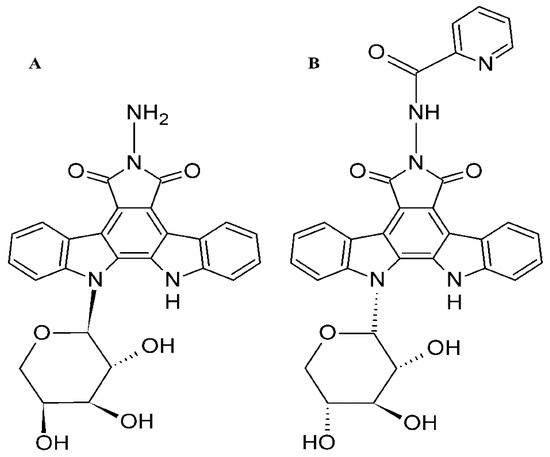 - Golubeva, I.S.; Eremina, V.A.; Moiseeva, N.I.; Ektova, L.V.; Yavorskaya, N.P. Derivative of the Class of n-glycosides indolo[2,3-a]pyrrolo[3,4-c]carbazole-5,7-dione-n-{12-(β-d-xylopyranosyl)-5,7-dioxo-indolo[2,3-a]pyrrolo[3,4-c]carbazol-6-yl} pyridine-2-carboxamide, Which has Cytotoxic and Antitumor Activity. Russia Patent 2667906c1, 21 March 2017. [Google Scholar]