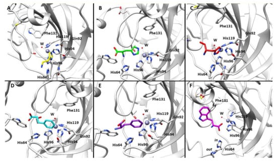 Cartoon views of hCA II/activator complexes as determined by X-ray crystallography. The activators are (A) histamine 12 in yellow (PDB 1AVN) [37]; (B) D-His 2 in green (PDB 2EZ7) [39]; (C) L-His 1 in red (PDB 2ABE) [39]; (D) D-Phe 4 in cyan (PDB 2FMZ); (E) L-Phe 3 in purple (PDB 2FMG) [42]; and (F) D-Trp 6 in magenta (PDB 3EFI) [42].