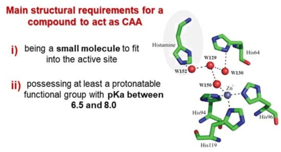 In particular, a CAA has to be a small molecule fitting into the active site and possessing chemical moieties able to participate to the proton-shuttling process (Figure 2). Such characteristics referred to specific examples will be properly discussed later, because small structural differences may impact a lot on this biological behavior.