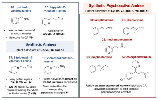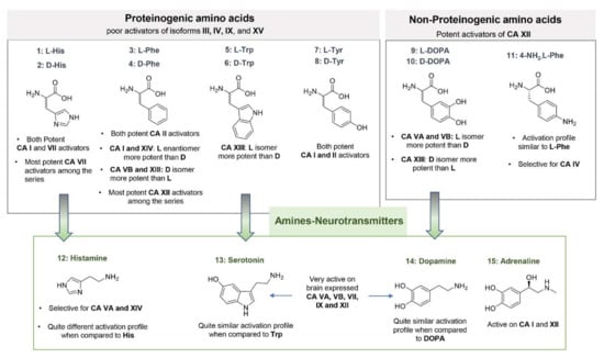Biogenic amines and amino acids are by far the most studied CA activators and represent the lead molecules for the design of new compounds endowed of this biological activity [35,38]. The kinetic data (KA), collected over the years profiling a pool of 19 amines and amino acids against the 13 catalytically active mammalians CAs (hCA I–XIV and murine (m) CA XV), allow us to draw some general observations about their activating properties and the possible contribution of CA activation to their complex biological activities (Figure 3 and Figure 4) [38]. Five psychoactive substances, including amphetamine and mephentermine, have been also analyzed quite recently against 11 out of the 13 mammalian isoforms, revealing to be able to activate specific CA isoforms, with very low KA values showed by some of them [48]. These results could imply a possible contribution played by CAs in the cognitive effects of such molecules.