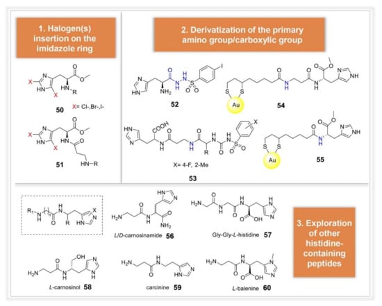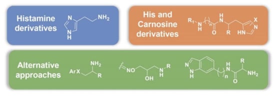 Three main design strategies can be found looking at the available literature data (Figure 5). The most exploited drug design approach is represented by the synthesis of histamine analogues, which also included the synthesis of histamine inspired compounds. Another quite used lead is represented by the amino acid His and its β-alanine dipeptide derivative carnosine, along with other His-containing peptides. In the third group we included the compounds obtained applying different approaches, not strictly related to the parent natural amines/amino acids.