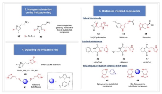 Another successful approach was represented by halogen(s) insertion on the imidazole ring, exploiting the withdrawing properties of halogens to affect compounds protonation state and the subsequent interaction with CA binding site (compounds 38 and 39, Figure 7) [59]. In particular, mono-halogenation gave better results than di-halogenation. Insertion of a second imidazole ring was also explored by Draghici et al., who designed bis-imidazoles of the type 40 in which the two imidazole rings were C-linked via an ethyl linker, bearing substituents of increased steric hindrance in the 2-position of the ring [60] (Figure 7). One imidazole moiety was inserted to work as proton-shuttle, whereas the other as anchoring point to CA active site rim. Small substituents placed in position 2 (H, CH3) led to very potent and selective hCA VA and VII activators, suggesting a different binding location of the imidazole ring depending on the isoform considered, driving the observed activation profile. Imidazole ring was found indeed to possess multiple binding sites within hCA II [61]. Following the same strategy, Akocak et al. also reported bis-histamine Schiff bases compounds, bearing different spacers between the two portions. Highly selective hCA VII derivative was represented by the furyl-containing compound 41 [62]. In the same work, the authors also explored the activating properties of bis-spinaceamine derivatives, representing the ring closure products of bis-histamine Schiff bases (compounds of the type 49). A series of diverse substituted spinaceamine derivatives, which can be considered as an “histamine-inspired compound”, was previously reported by the same authors and the compounds profiled as CA activators, showing nanomolar potencies against hCA VII [63]. Analogously, bis-spinaceamine derivatives showed high potency and selectivity against this isoform, with no significant differences observed among the reported compounds, bearing different spacers between the two active portions. Quantum mechanical (QM) calculations were very recently performed on some of these bis-histamine Schiff bases and bis-spinaceamines, indicating that the activator participates to the proton-shuttling process from the zinc-bound water molecule to the medium and that the electrostatic interactions between the activators and hCA VII are the driving force of the enzyme-activator complex formation [64]. L-(+)-Ergothioneine 42, Melatonin 43 and Spinacine 44 as well as synthetic compounds 45–47, recently studied as CA activators, should be also mentioned among the histamine inspired compounds (Figure 7) [65]. A strong selectivity for the abundantly CNS expressed hCA VII was observed also for these compounds, which showed to be 10 times more potent than the reference compound histamine. The in vitro results were also corroborated by docking studies [65].
