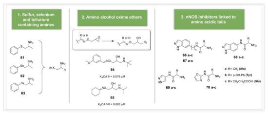 Alternative and unconventional approaches for the design on new CAAs were recently reported in the literature by different groups. In 2019, Tanini et al. reported the synthesis and biological evaluation of organic chalcogenides structurally related to the psychoactive drug amphetamine (compounds 61–63, Figure 9) [71]. Compounds were obtained by ring opening of strained aziridine with chalcogen nucleophiles, to give β-arylchalcogeno amines containing sulfur, selenium and tellurium. This quite large series showed good activating properties against the isoforms hCA I, VA and VII and a potent antioxidant activity, especially for selenium and tellurium compounds, which were able to prevent ROS metabolites generation and the consequent cellular stress and damage. These compounds are, therefore, of great interest in the field of neurodegenerative disorders treatment, where the levels of ROS are particular high. More recently, a large series of amino alcohol was reported by Nocentini et al. obtained by ring opening of differently substituted epoxydic oxime ethers with isopropylamine or tert-butylamine [72]. These compounds were designed using as lead the β-amino alcohol timolol, previously found to act as CAA [73]. The synthetized compounds were assayed as CAAs against four physiologically relevant hCA isoforms expressed in human brain, showing KA values spanning from the low micromolar to the medium nanomolar range. Compounds 64 and 65 in particular revealed to be highly selective for the isoform CA II and VII, respectively, opening new perspectives in the design of potent and selective CAAs based on the amino alcohol scaffold, as valid alternative to amines and amino acids [72] (Figure 9).