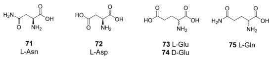 As seen above, the most extensively studied CAAs usually belong to amines and amino acids as chemical scaffolds and compounds 1–19 (Figure 1) were always tested for their activation of non-human CA isoforms. Moreover, other amino acids (71–75, Figure 11) were recently introduced to better understand the general structural requirements for such activity. The use of the same panel of activators by the same research group can be considered a straightforward strategy to rationalize the differences within the series of related targets and to gain more robust information about the impact of the stereochemistry in the biological interaction.