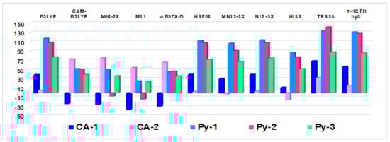 The meta-GGA hybrid functionals were chosen as an increasing order of the percent of Hartree–Fock exchange (HFX%) added to the functional, whereas the RSH functionals were chosen to be belonged to three different categories. Namely the screened-exchange functionals (HSE06, N12-SX and MN12-SX) for which the HFX% decreases monotonically from a finite value (25%) at short interelectronic separations (short range) to zero at long interelectronic separations (long range); the middle-range functional (HISS) for which HFX% increases from zero at short range to a finite value (60%) at medium interelectronic separations and then decreases to zero at long range; the long-range-corrected functionals (M11 and ωB97X-D) for which HFX% increases monotonically from a finite value at short range to 100% at long range; and the CAM-B3LYP functional, for which X increases monotonically with increase in interelectronic separation, but not all the way up to 100% at long range. The mean signed deviation was calculated as: , for the absorption maximum wavelength (λmax) obtained using the eleven XCFs. While the mean absolute error (MAE) was calculated as: . As shown in Figure 1, M06-2X as well as the long-range corrected functionals (M11, CAM-B3LYP and ωB97X-D) outperform other functionals in reproducing the excitation energies of pyridine anchor-based set (Py1-Py3) and providing the least MSD. Among these functionals, the long-range-corrected RSH meta-GGA functional M11 is the best performing XCF with MSD of ca. +26, 14, 24 nm for Py1, Py2 and Py3, respectively. Whereas, for the –COOH anchor-based set (CA1 and CA2), the screened-exchange meta-NGA functional MN12-SX and the middle-range functional (HISS) are the most accurate. This could be attributed to the different types of excitations and different degree of spatial overlap between frontier molecular orbitals. In systems with large rearrangement of charge upon photoexcitation, the asymptotic behavior of M11, M06-2X, CAM-B3LYP and ωB97X-D functionals could lead to a better description of the excitations. In terms of MAE, the values were found within a range of 26–78 nm, with following trend: M11 < M06-2X < ωB97X-D < CAM-B3LYP < HISS < MN12-SX < HSE06 < N12-SX < B3LYP < τ-HCTH hyb < TPSSh. For the present two sets of molecules, the most reliable XCF turns out to be M11, with a MAE of 26 nm.