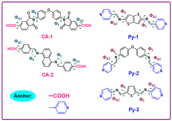 According to the basic principle of DSCs, after excitation of the dye by incident light, an oxidized state of the dye is formed by electron injection into the conduction band (CB) of the anode (here TiO2). Since maintaining the planarity between the anchoring group and the molecular plane is critically required for the ease of charge flow and electron injection into the CB of TiO2, then we could argue that Py-1 and Py-2 dyes will show enhanced electron injection efficiency, according to their lowest values of ΦA1 and ΦA2 dihedral angles.