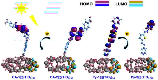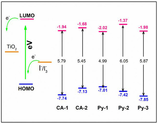 For efficient operation of DSC, the lowest unoccupied molecular orbital (LUMO) of the dye should be higher than the CB (−4.00 eV) of TiO2, with at least 0.2 eV [63], to guarantee efficient electron injection. Similarly, the highest occupied molecular orbital (HOMO) of the dye should lie below the energy level (−4.8 eV) of the iodine/triiodide () redox electrolyte for effective regeneration of the oxidized dyes. The energy levels involving EHOMO and ELUMO and their energy gaps of all new dye molecules are shown in Figure 3, together with the energies of redox potential and CB of TiO2 for a direct comparison. It can be seen that the calculated LUMO energy levels of all dyes range from −2.02 to −1.37 eV, which are about 1.98 to 2.63 eV higher than the CB of TiO2. Accordingly, thermodynamically favored electron injection reactions can be predicted for both CA and Py dyes. Additionally, the HOMO energy levels ranging from −7.85 to −7.01 eV are significantly lower than the electrode potential of the redox couple (−4.8 eV), implying that thermodynamically favored regeneration reactions are expected for all dyes. Evidently, EHOMO and ELUMO of all studied dyes meet the basic energetic requirements for operating DSCs; however, the HOMO level of Py-3 shifts toward more negative value (−7.85 eV) suggesting easier regeneration of the oxidized dye with greater driving force, when compared to other dyes.
