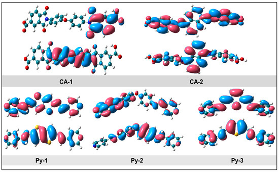 The contour plots of the FMOs for the six dyes are depicted in Figure 4. Considering CA-1 and Py-2 dyes, the HOMO electron density is mostly located on the diphenyl ether unit, whereas the LUMO is predominantly spread to the acceptor units, which satisfies the requirements of the molecular orbital for charge separation. Distinct hole-electron separation could not be estimated for CA-2 and Py-3 dyes as the electron densities of their FMOs are nearly distributed throughout the entire molecular backbones. Concerning Py-1 dye, its structural attributes and pattern of FMOs distributions can suggest promising injection of excited charge into CB of TiO2, particularly for increased localization of LUMO on the pyridine anchor as conjugated with the imine group. The same conclusion was previously drawn for some squarine dyes with planar structure and great π–electron density conjugation along molecular backbone [64].