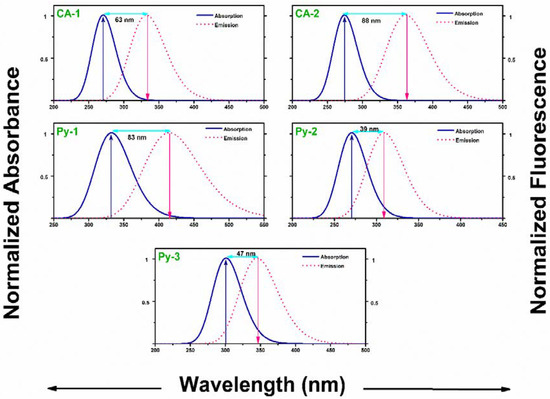 Figure 6 displays the computed emission spectra of the synthesized dyes along with a comparison with the corresponding experimental absorption maxima and calculated Stokes shift (red shift) of the fluorescent state. Notably, emission spectra of the studied dyes showed emission peaks in the range of 309–415 nm. The optimized geometries of emission states are shown in Figure S3 (see the Supporting Information). The optimized structures show that Φ3 and dihedral angle of CA-1 has decreased by ca. 25° in comparison to the ground-state. Similarly, an enhanced planarity has been obtained for Py-3 dye with ca. 18° lower ΦA1 and ΦA2 relative to the ground-state geometry.
