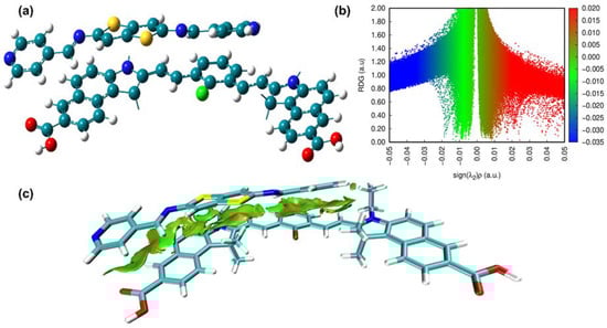 Overall, the total interaction energy, ΔEtot of −38.07 kcal/mol, indicates that the formation of Py-1/VG20 dimer is favored by the steric, electrostatic, as well as orbital interactions. Figure 10b depicts the plot of reduced density gradient (RDG) versus sign(λ2)ρ, the sign of second Hessian eigenvalue (λ2) multiplied by electron density ρ(r). Therein, electron density ρ(r) defines the strength of interactions; namely low ρ(r) regions are related to the dispersion or vdW weak interactions (green dots) and high ρ(r) regions related to stronger interactions, either stabilizing attractive (λ2 < 0) such as H-bonds (blue dots) or destabilizing repulsive (λ2 > 0) such as steric (red dots) interactions. As shown in Figure 10b, the spike at the negative part with low-density (ρ(r) ≈ 0), low-gradient (RDG < 0.5 au) approves the calculated stabilizing vdW attraction energy ΔEdisp of −5.012 kcal/mol. Additionally, low-gradient (RDG < 0.5 au) blue dots at sign(λ2)ρ(r) of ca. −0.025 au indicates the presence of the stabilizing H-bonding interaction in the studied dimer.