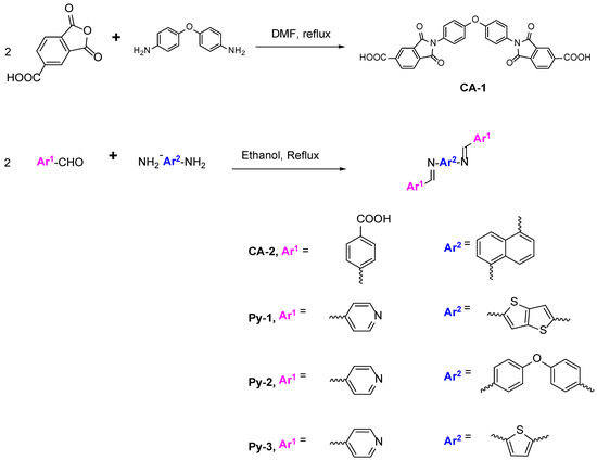 Synthesis of diimide CA-1 and Schiff bases CA-2 and Py-1-3.
