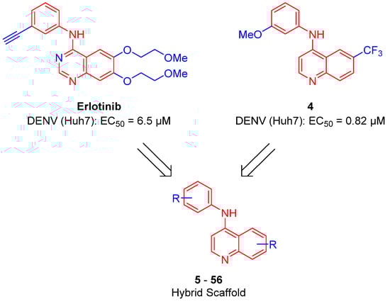 Building on our previous work, to further explore the antiviral activity of the 4-anilinoquin(az)oline [14,32,33], we probed the structure activity relationships (SAR) with a series of focused libraries. We developed a series of hybrid molecules combining structural features of erlotinib and lead compound 4 to enhance the SAR in the current literature and improve the tractability of the quin(az)oline scaffold (Figure 2).