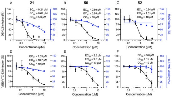 Figure 3. Compounds 21, 50 and 52 suppress both DENV2 and VEEV (TC-83) infection. Dose response of DENV2 (black) and cell viability (blue) to compounds A: 21, B: 50, C: 52 and dose response of VEEV (TC-83) (black) and cell viability (blue) to compounds D: 21, E: 50, F: 52; each measured by luciferase and AlamarBlue assays, 48 h post-infection (AC) or 18 h post-infection (DF). Data are plotted relative to DMSO control. Shown are representative experiments from at least two conducted, each with 4 biological replicates; shown are means ± SD.