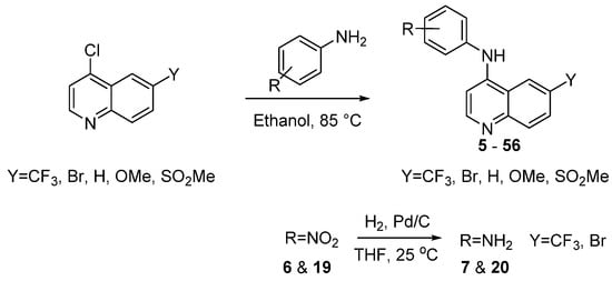 We suspended 4-chlo-quin(az)oline derivative (1.0 eq.), aniline derivative (1.1 eq.), in ethanol (10 mL) and refluxed for 18 h. The crude mixture was purified by flash chromatography using EtOAc:hexane followed by 1–5% methanol in EtOAc; After solvent removal under reduced pressure, the product was obtained as a free following solid or recrystallized from ethanol/water. Compounds 431 were synthesized as previous described [38,48], 32-51 were synthesized as previously described [42]. Representative supporting information provided (see Supplementary Materials).