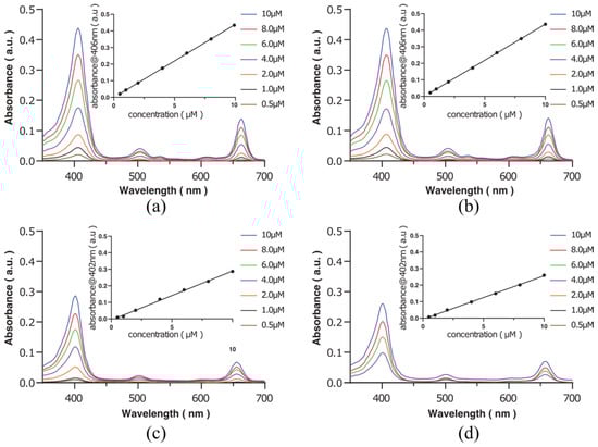 UV-Vis spectra of Ce6 in DMSO (a) and PBS (c), as well as Ce6-biotin in DMSO (b) and PBS (d). The insets plot the absorbance of the Q-band versus the concentration of Ce6 and Ce6-biotin.
