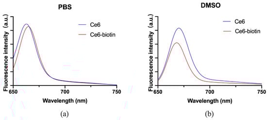 Fluorescence spectra of Ce6 and Ce6-biotin (2 μM) in PBS (a) and DMSO (b).